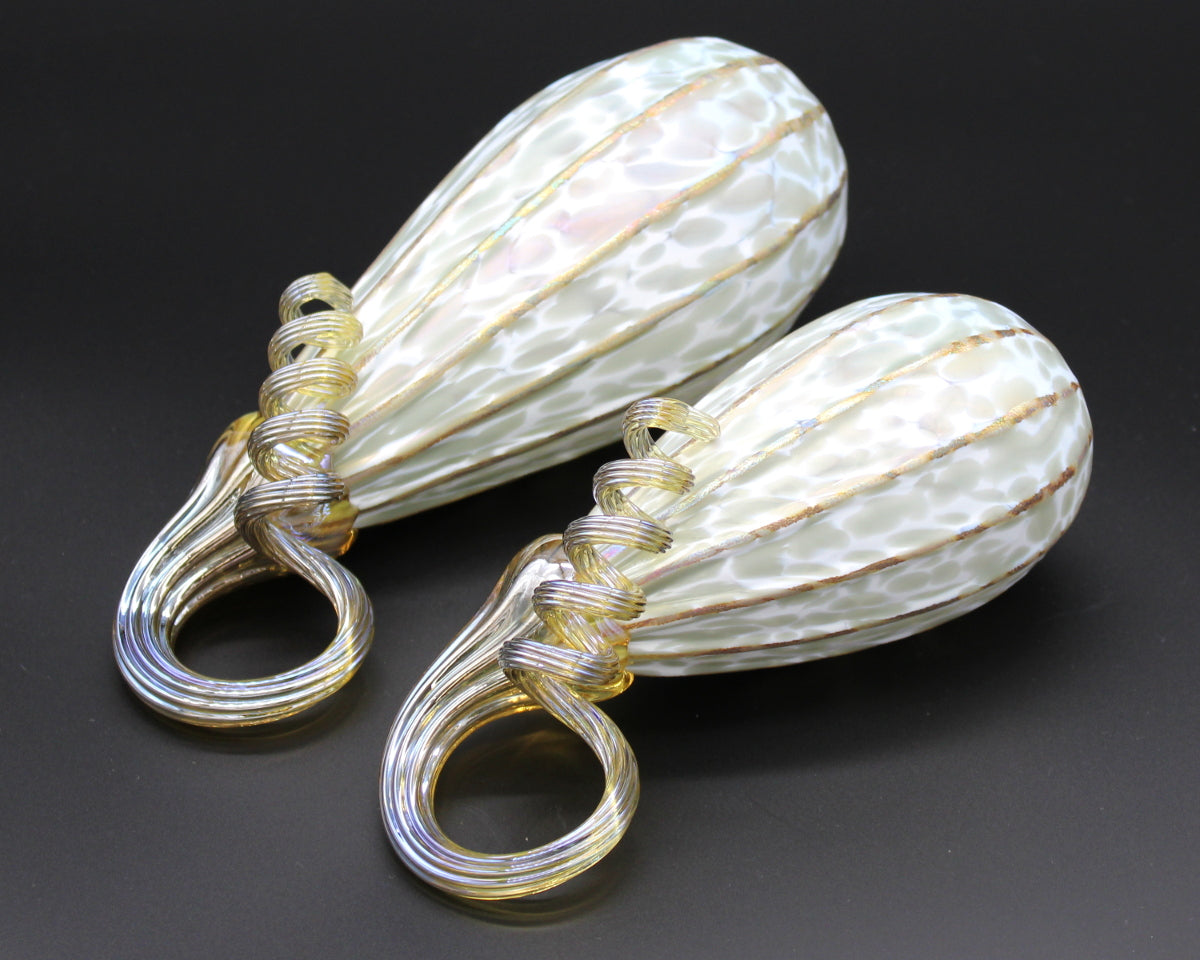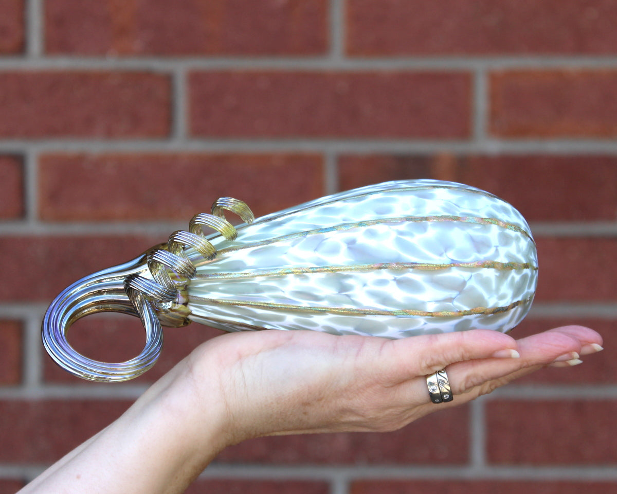ASPEN WHITE pumpkins and gourds are available in seven different shapes/sizes. Each piece is individually blown and hand sculpted, not formed from a mold. Each piece is signed. All measurements are approximate.