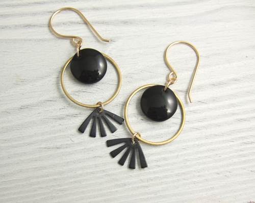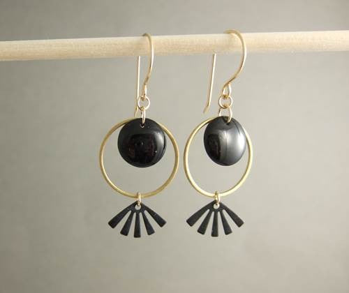 Brass circles frame black glass disk beads; oxidized brass fans dangle below. Gold-filled french ear wires. Approx 2 inches long and 3/4 inch wide.