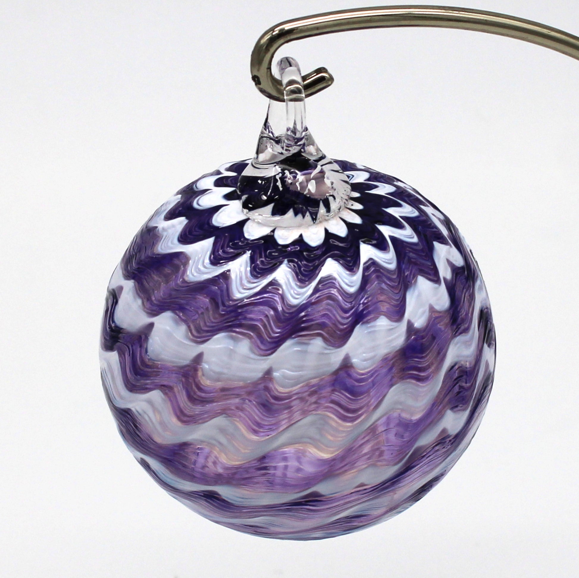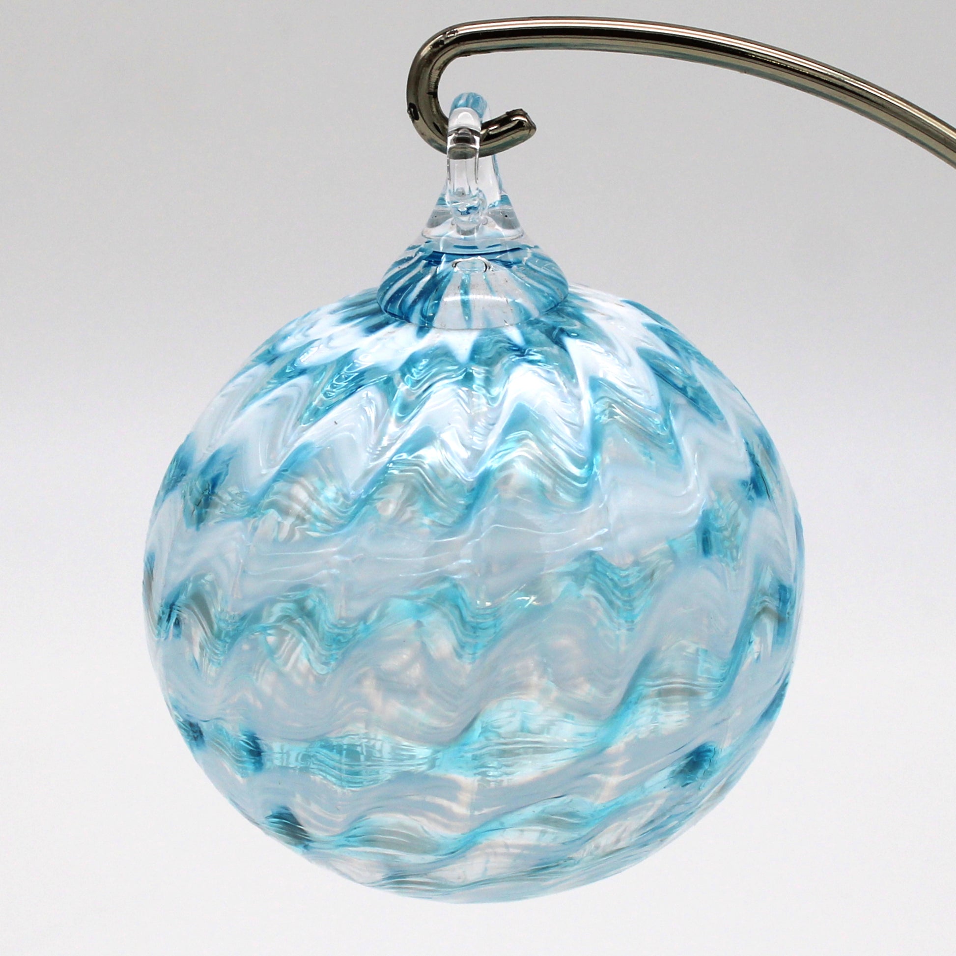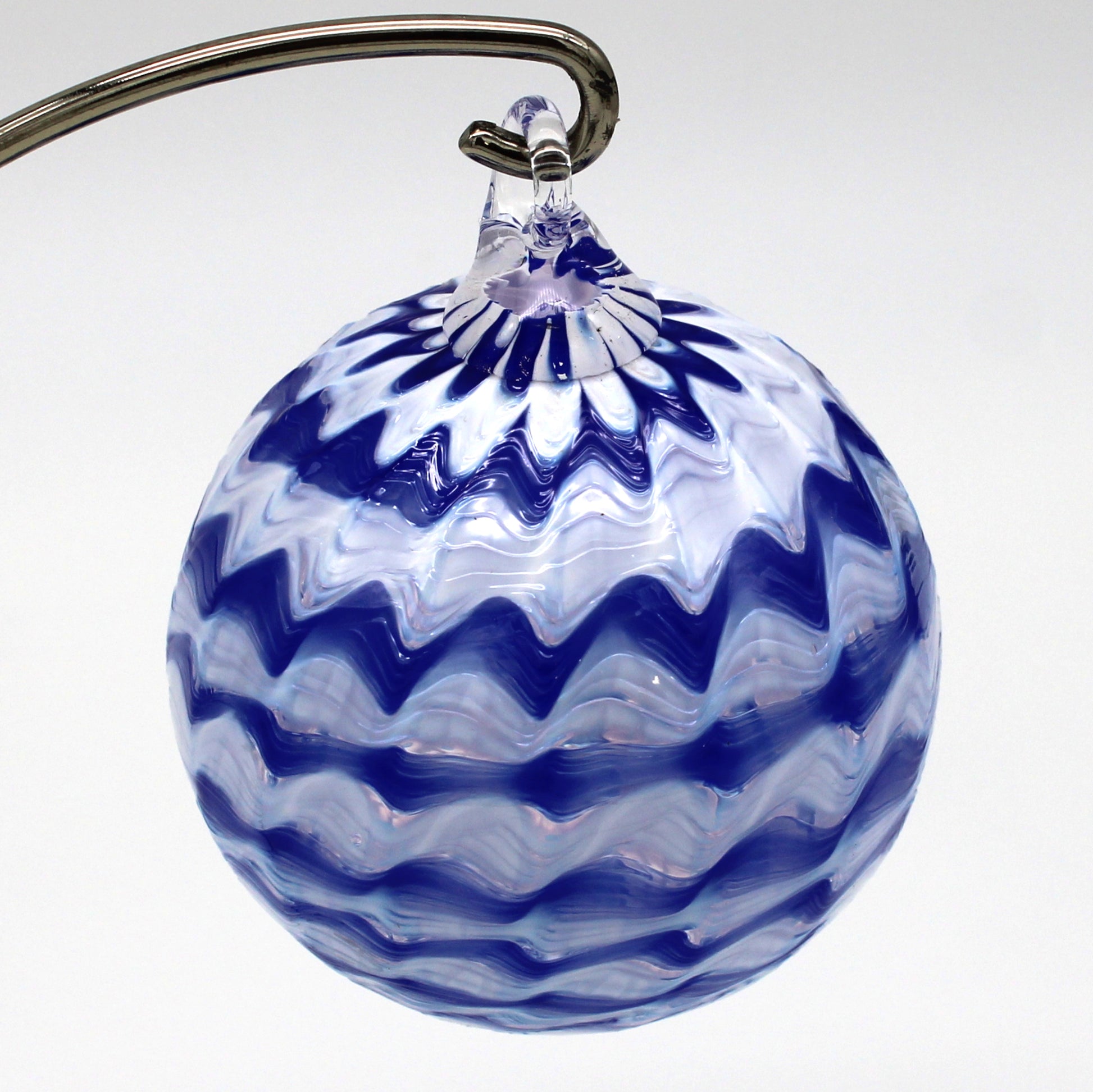 Zig-zagging lines of white alternate with translucent colors on these globe ornaments made of blown glass. The white/gold color combo has a lightly matte finish; the other colorways are glossy.