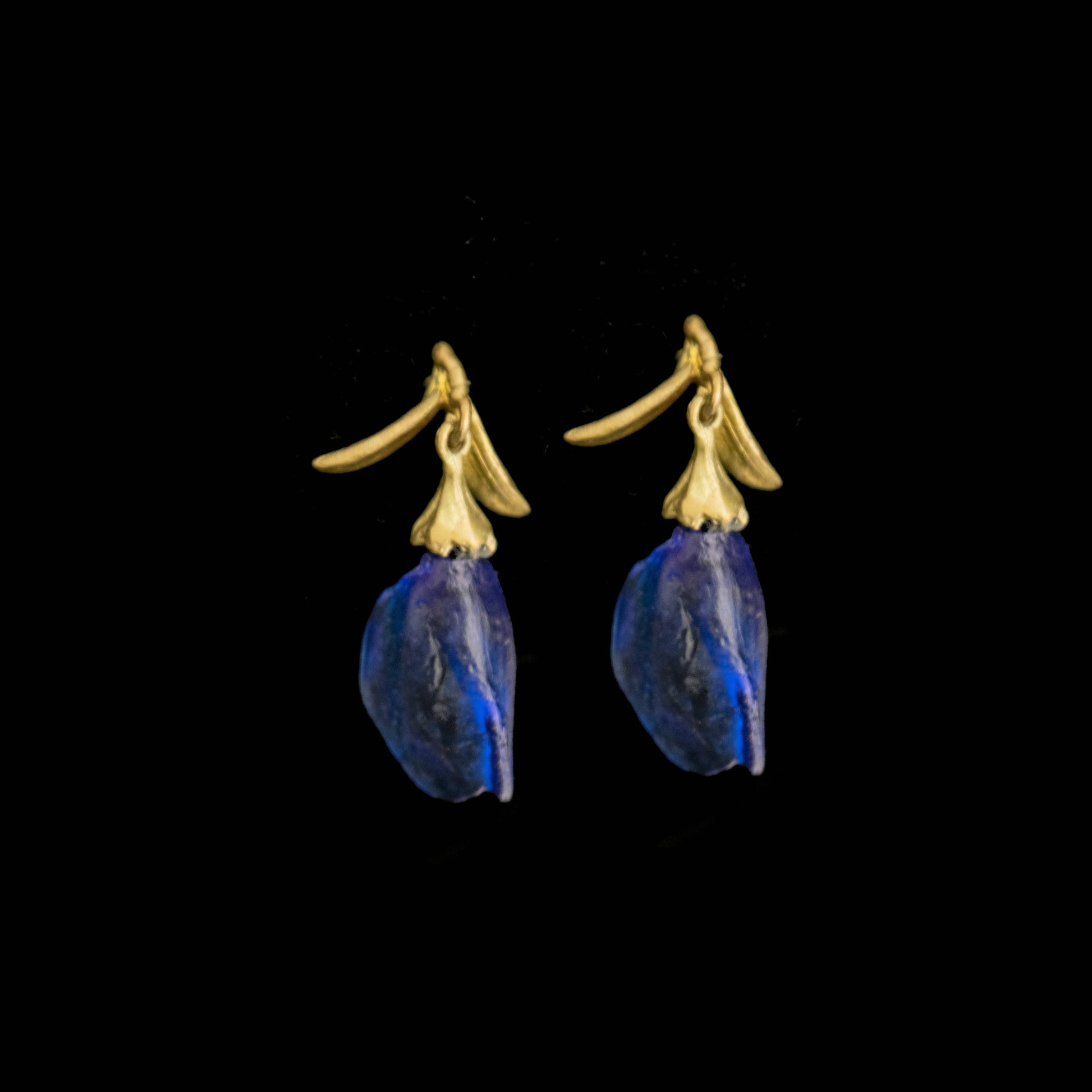 Cast bronze post earrings with a hand patina finish. Accented with cast glass in the form of a false indigo flower.