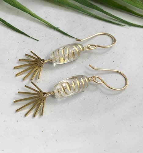 Clear glass beads accented with gold lines dangle from gold-filled french ear wires. Raw brass rays hang at the bottom.
