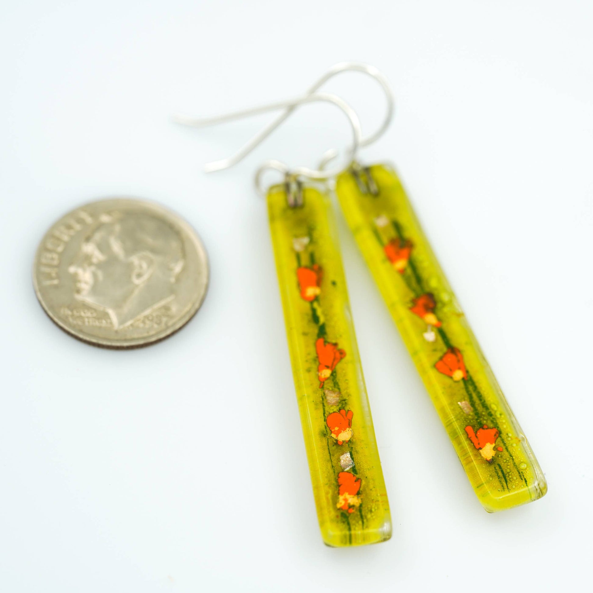 A celebration of Spring and Summer in one striking bar earring! Vibrant California poppies are hand-painted against a spring green background and then sandwiched between layers of upcycled glass to give it added depth and luminousity. The ear wires are argentium silver (nickel-free, slow tarnish) and come with silicone ear backs included.