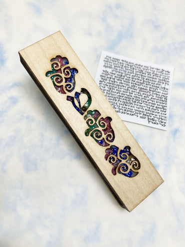 Available in an array of colors, this mezuzah combines a fused glass element with laser-cut maple wood to depict the Hamsa—a symbol of happiness, health, good fortune, and protection from evil. Perfect for standing guard over the home, it comes in a gift-ready box with a non-kosher scroll, an information card on the process, and double-sided tape for easy installation.