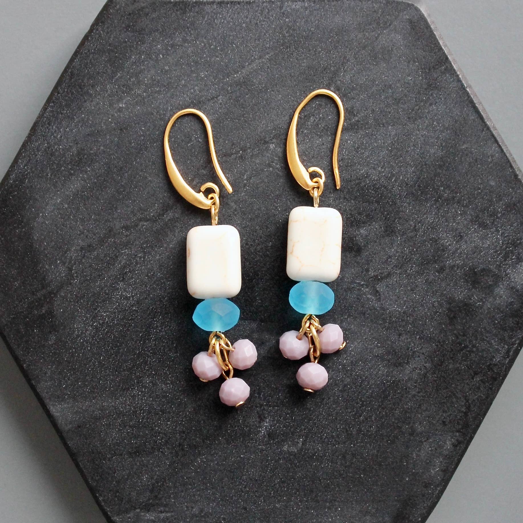 18k gold plated brass hooks with glass and magnesite beads.