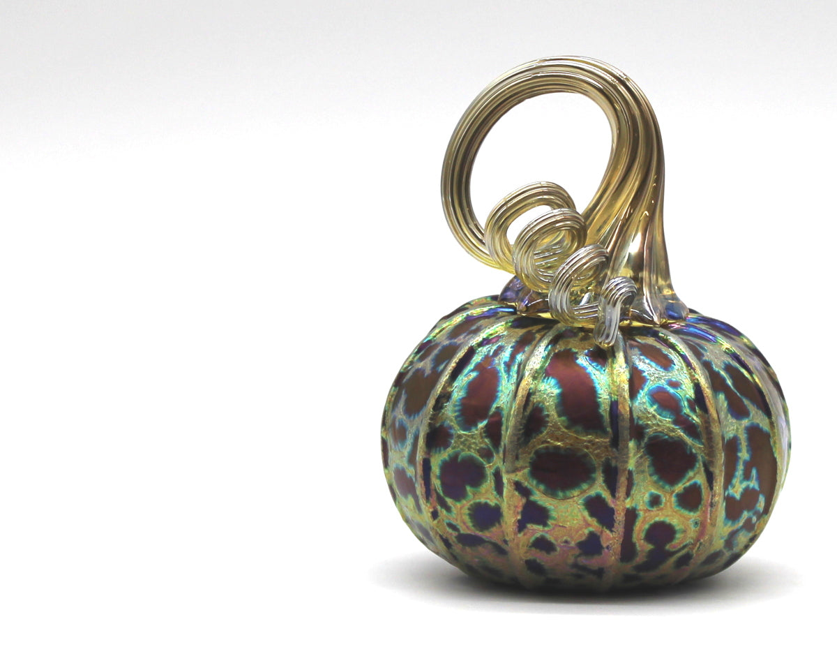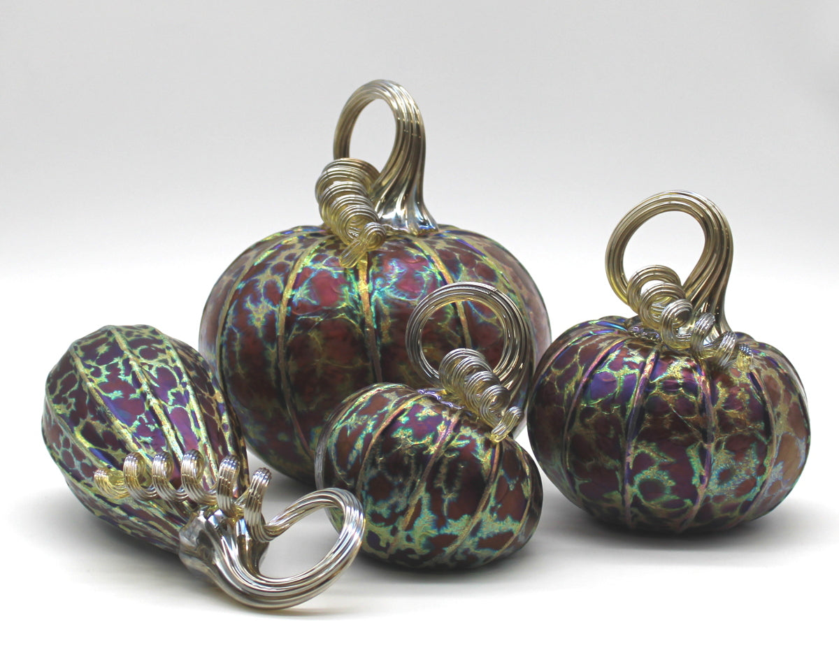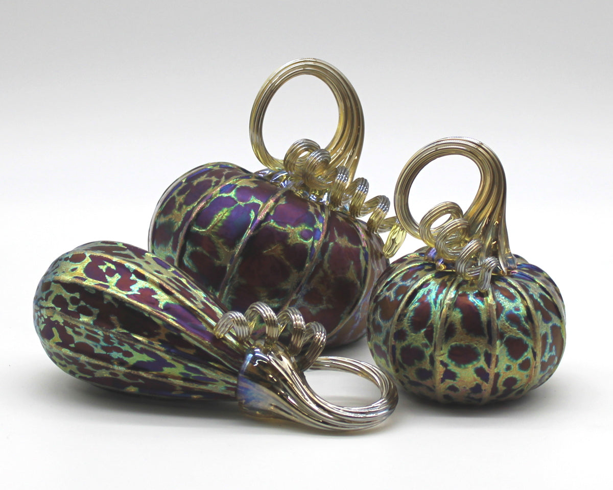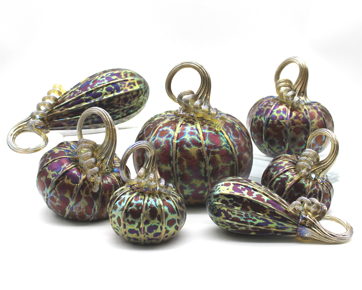 The MIDNIGHT colorway features multi-layered hues of purple, burgundy, and gold; the gold is often edged with shimmery hints of blue and green. MIDNIGHT pumpkins and gourds are available in seven different shapes/sizes. All sizes listed are approximate. Each piece is individually blown and hand sculpted, not formed from a mold. Each piece is signed.