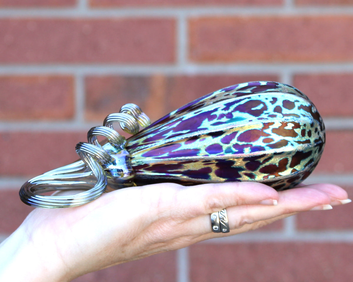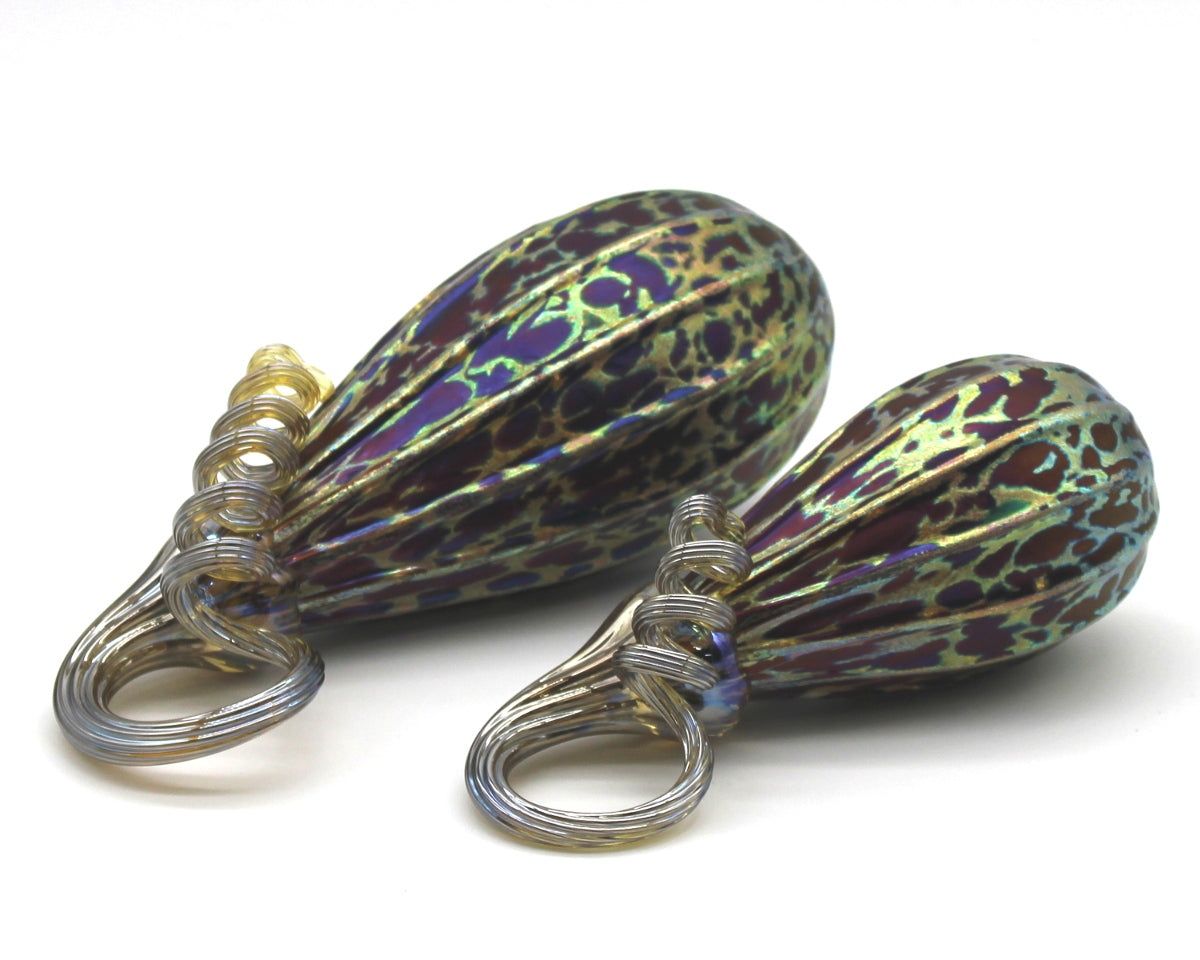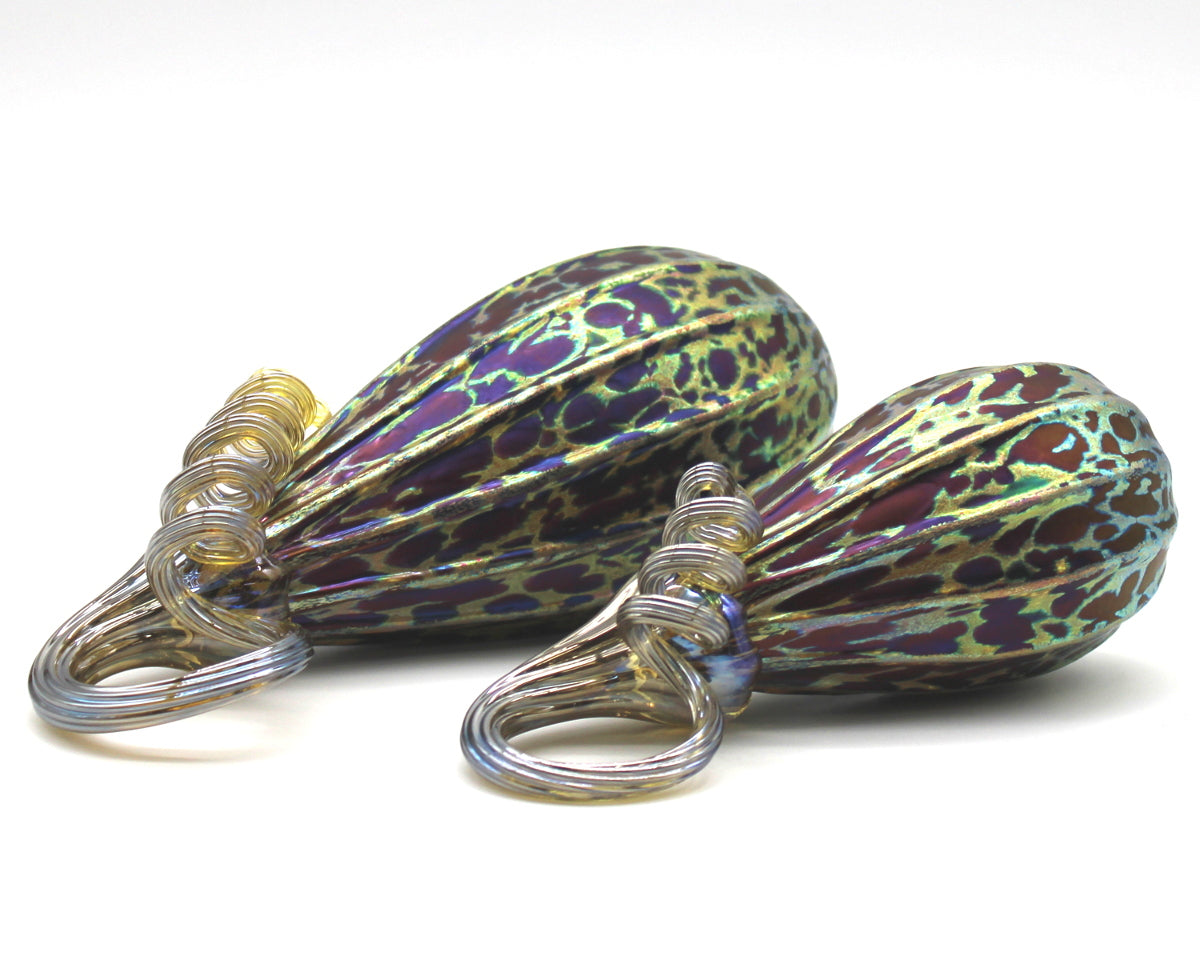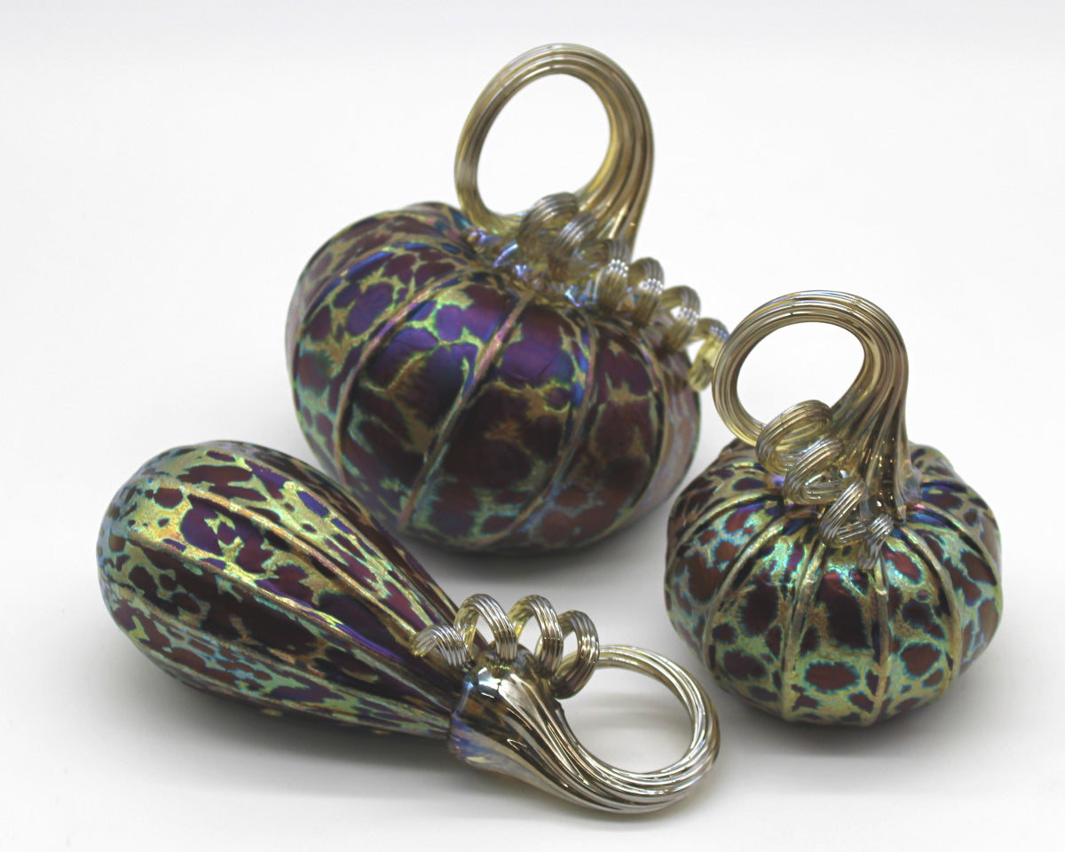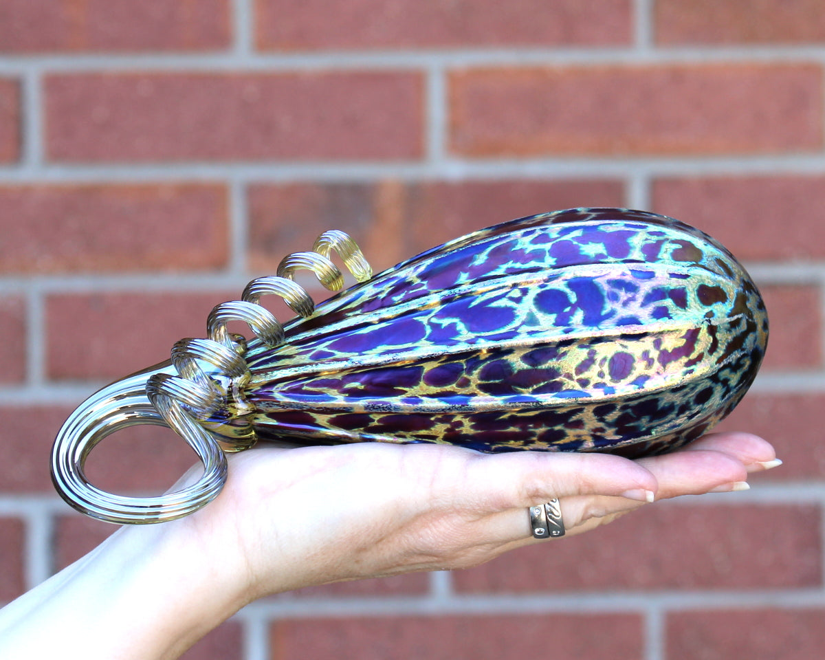 The MIDNIGHT colorway features multi-layered hues of purple, burgundy, and gold; the gold is often edged with shimmery hints of blue and green. MIDNIGHT pumpkins and gourds are available in seven different shapes/sizes. All sizes listed are approximate. Each piece is individually blown and hand sculpted, not formed from a mold. Each piece is signed.