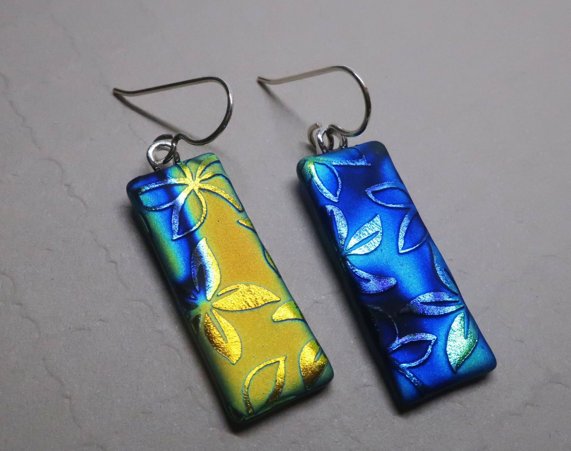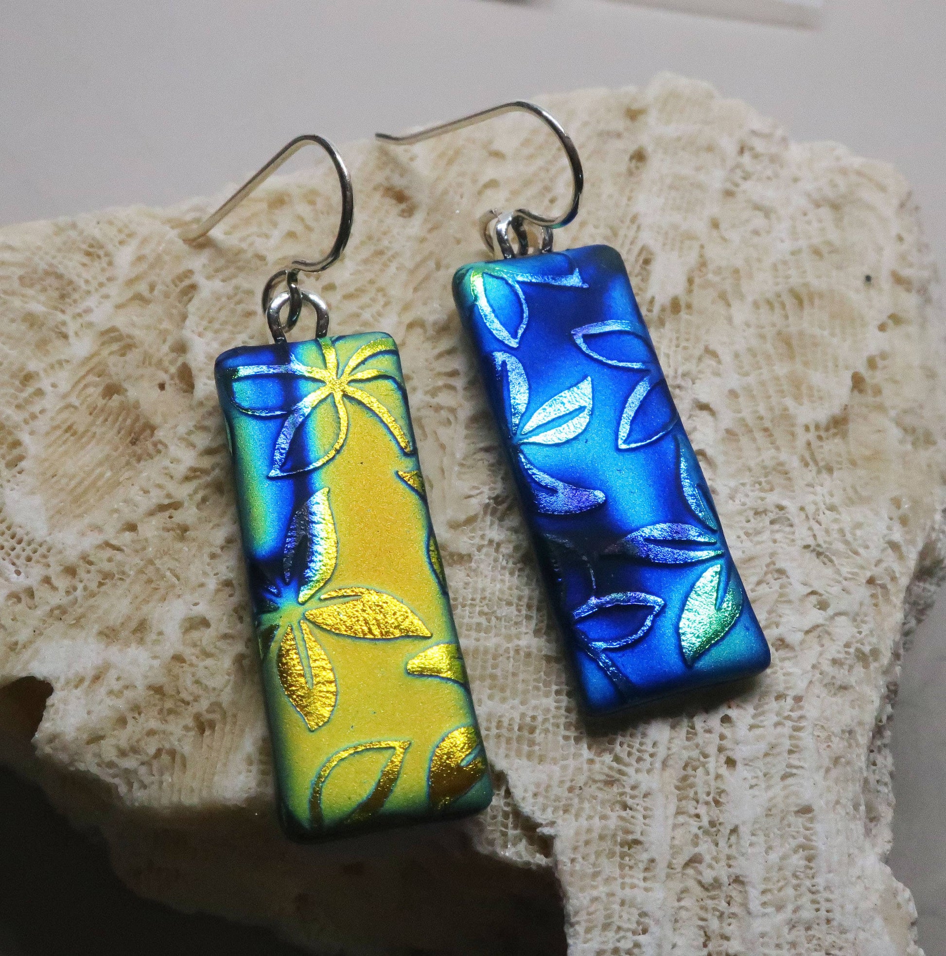 Combining a mix of matte and shiny finishes, these stunning earrings feature a floral pattern across variegated blue and gold dichroic glass. Sterling silver ear wires are 20 gauge; the glass measures 1.25" x 0.5" and hang approximately 1.75" long.