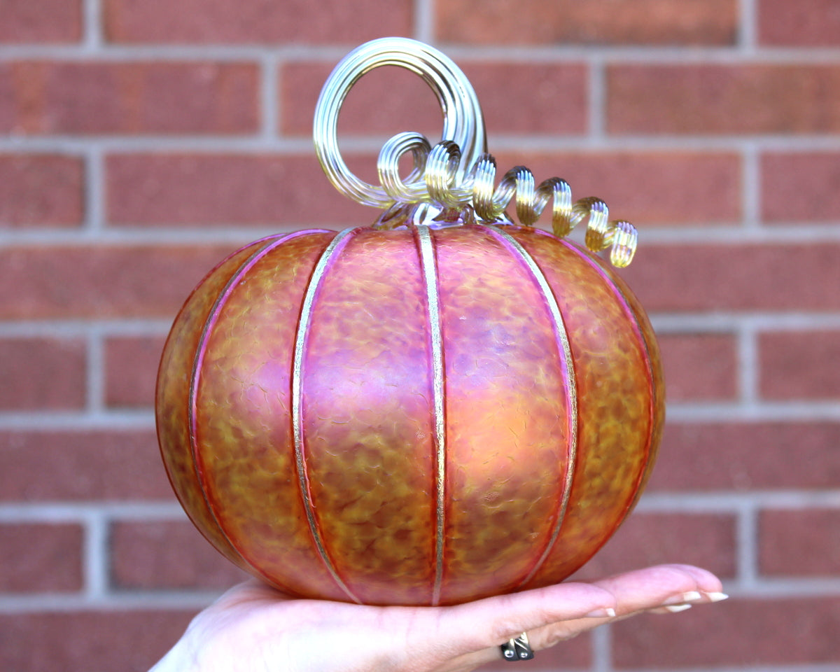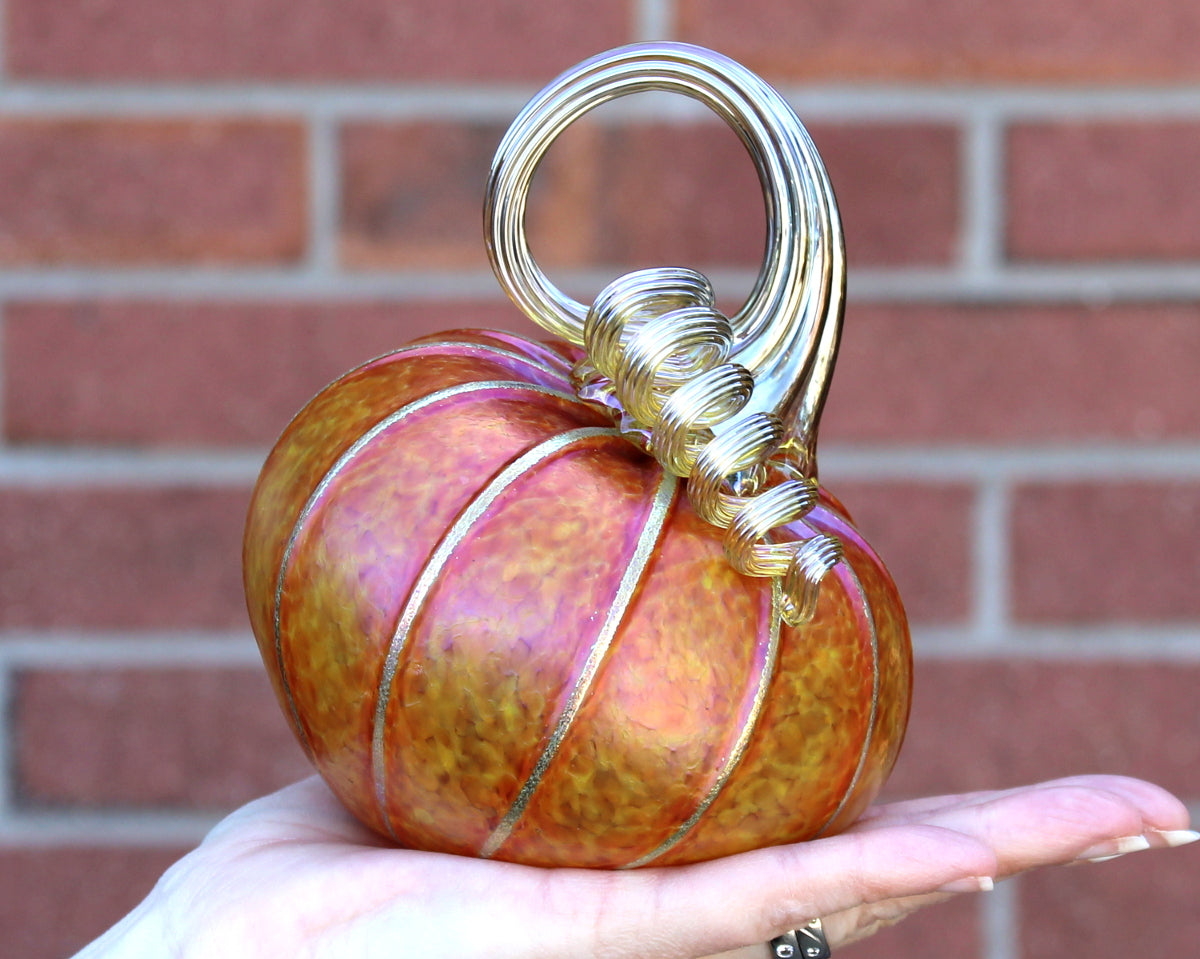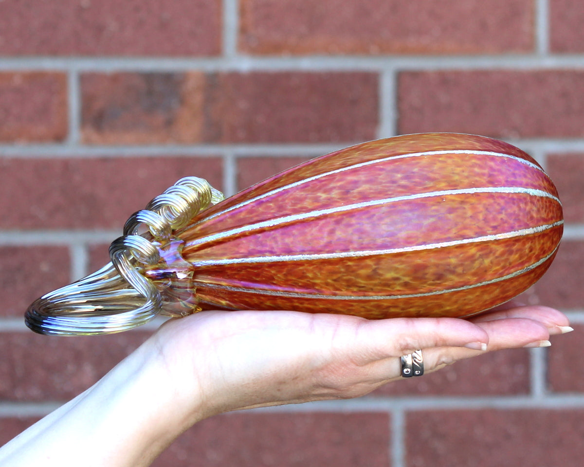 SUNRISE pumpkins and gourds are available in seven different shapes/sizes. All sizes listed are approximate. Each piece is individually blown and hand sculpted, not formed from a mold. Each piece is signed.