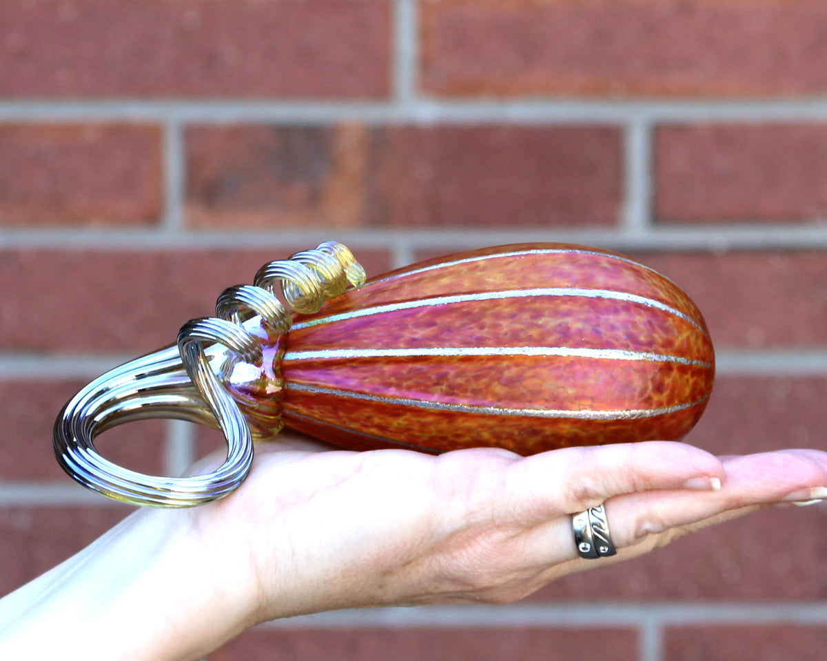 Our blown glass pumpkins and gourds are hand-crafted by a team of skilled artisans in our Colorado hotshop. Featuring richly layered colors and refined accents, these pumpkins also serve a broader purpose. Blowing glass often requires teamwork and assistance from others--much like surviving and thriving in life is easier done with the supportive assistance of family, friends, and a broad community.