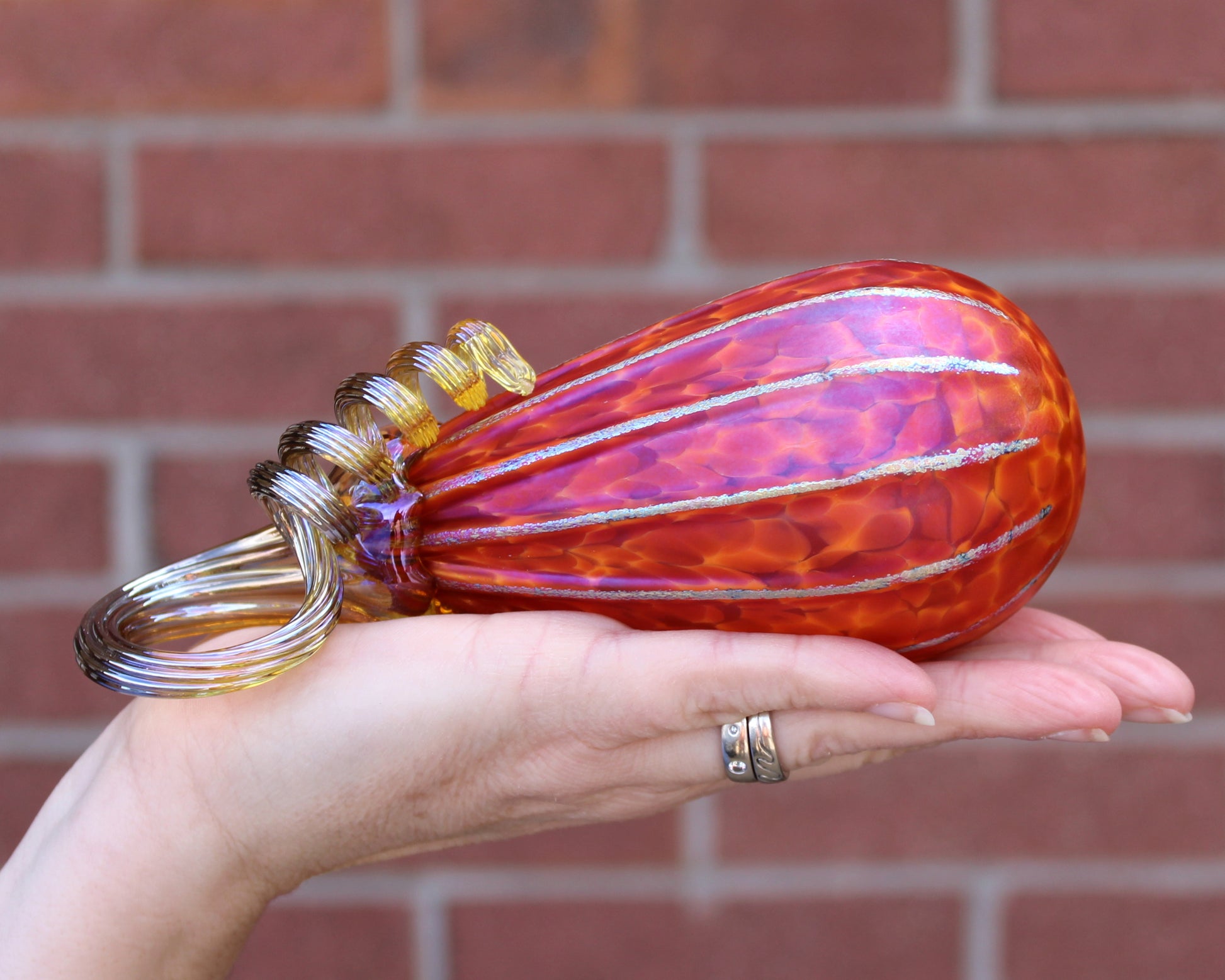 One of our most popular, the TANGELO colorway is a multi-layered orange with hints of ruby red. Individual TANGLEO pumpkins and gourds are available in seven different shapes/sizes. All sizes listed are approximate. Each piece is individually blown and hand sculpted, not formed from a mold. Each piece is signed.