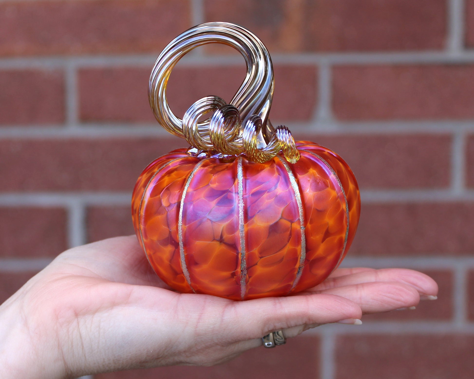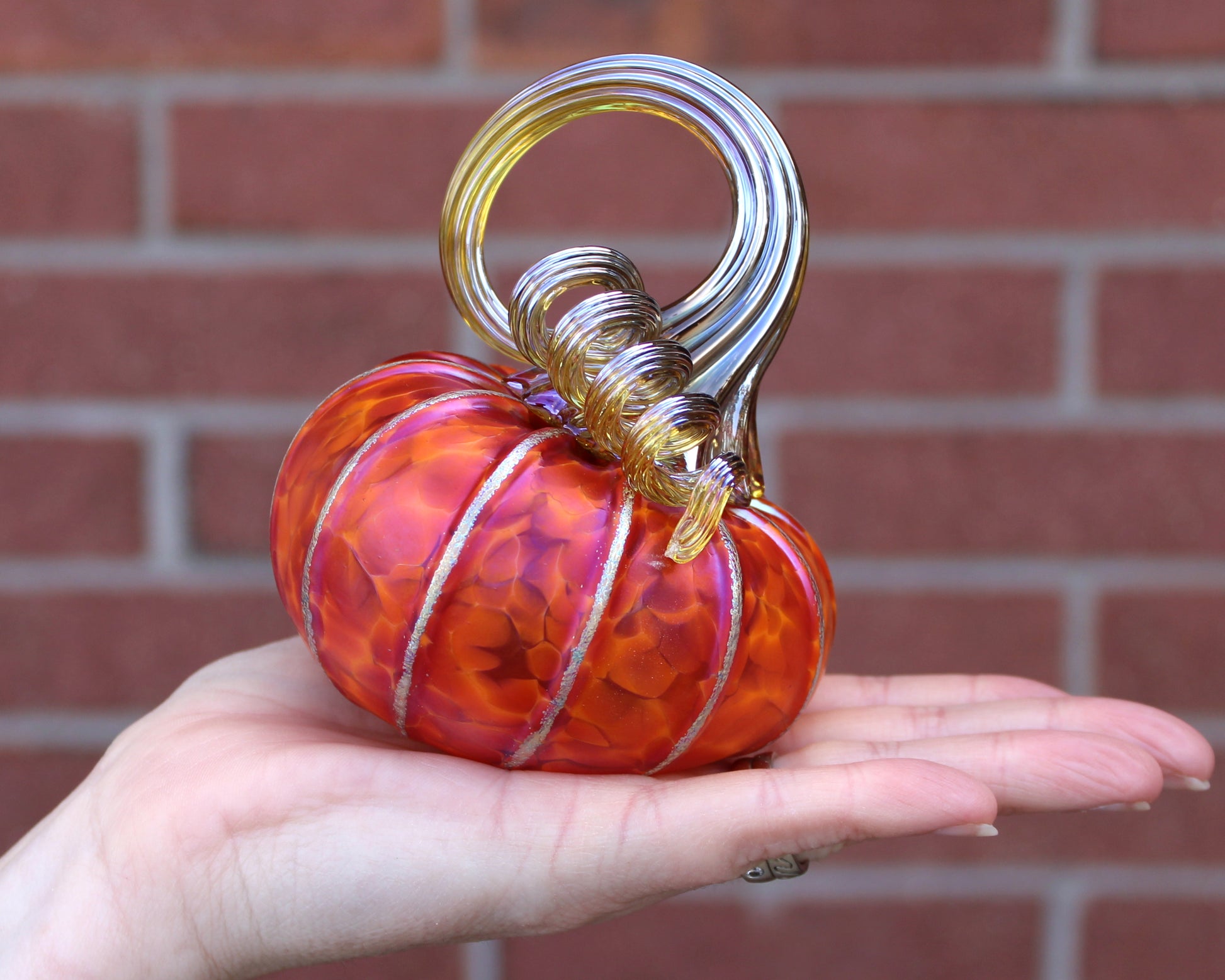 Our blown glass pumpkins and gourds are hand-crafted by a team of skilled artisans in our Colorado hotshop. Featuring richly layered colors and refined accents, these pumpkins also serve a broader purpose. Blowing glass often requires teamwork and assistance from others--much like surviving and thriving in life is easier done with the supportive assistance of family, friends, and a broad community.